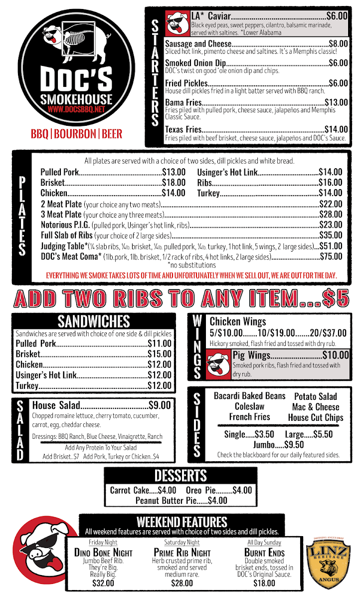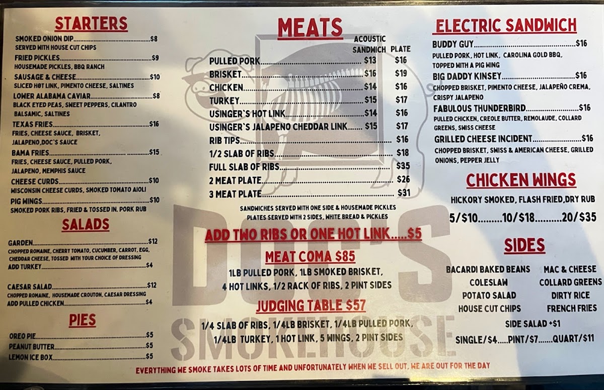 Welcome to DOC's Smokehouse Dyer, a notable BBQ haven located at 1420 B Calumet Ave, Dyer, IN. With an inviting atmosphere and a menu that celebrates the art of hickory smoking, DOC's offers a range of mouthwatering dishes that are sure to please. Start your culinary journey with the Trucker Snack, a delightful blend of sliced sausage and pimento cheese, or indulge in the Smoked Onion Dip, served with house-cut chips.